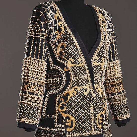 Das Dole Pearl Blazer Kleid ist ein echter Hingucker und lässt Sie sich wie die Ballkönigin fühlen! Es besticht durch exquisite Perlenverzierungen und ein wunderschönes Goldmuster, die Eleganz und Raffinesse ausstrahlen. Die Minilänge setzt Ihre Beine perfekt in Szene und macht es zum idealen Begleiter für einen Abend in der Stadt. Entworfen für die modebewusste Frau, lässt sich das Dole Pearl Blazer Kleid mit funkelnden Accessoires für einen zusätzlichen Hauch Glamour kombinieren!