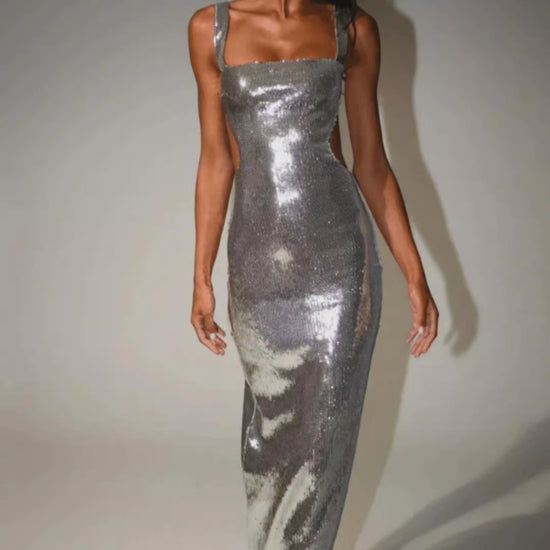 Crafted from high-quality polyester with a silky drape, the dress glides beautifully over your figure. The structured square neckline adds architectural elegance, while the stunning backless design introduces a touch of contemporary sensuality — making this the perfect dress for unforgettable nights.